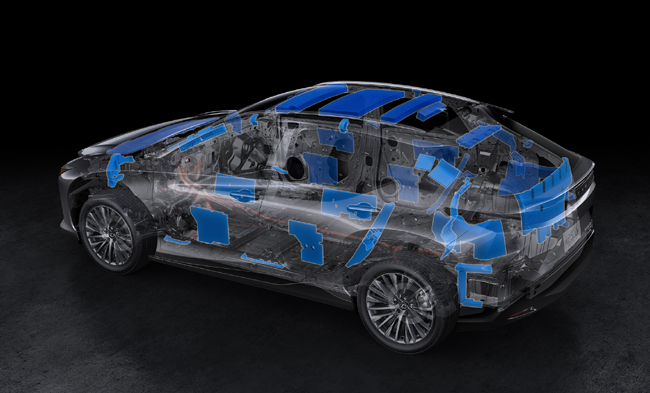 ▲静粛性および耐振性のさらなる向上も敢行。後席下にはリアフロアサイレンサーを設定してノイズを抑制。ドアトリム、シートサイドガーニッシュ、バックドアトリムの防音材を高性能化するとともに、シートサイドガーニッシュ部の使用範囲を拡大する