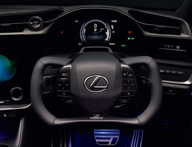 走りの楽しさをさらに追求したRZ550e“F SPORT”に関しては、従来のコクピットに大きな変革をもたらす「ステアバイワイヤシステム」を導入する。同システムは従来のタイヤとステアリングが機械的に結合するシステムとは異なり、電気信号によってタイヤの動きを制御するため、路面からドライバーに伝わる振動を効果的に抑制すると同時に、路面の状態をセンシングし運転に必要な情報のみをドライバーへ伝達。BEVモデルならではの、人とク ルマが一体となる、直感的で快適な全く新しいドライビング体験を創出している。