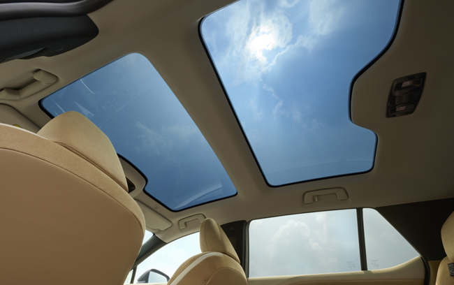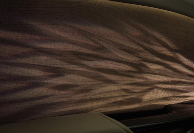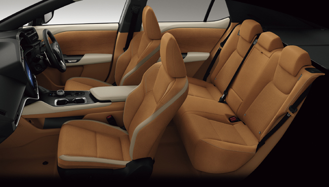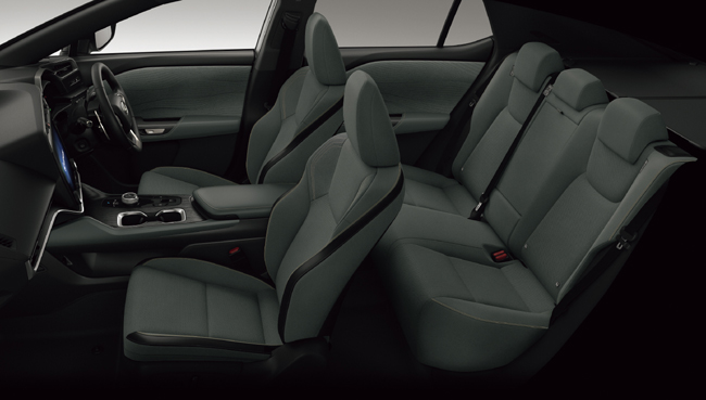 内包するインテリアは、レクサスのクルマ作りに根づいている人間中心の思想を、さらに進化させた新しいコクピット設計の考え方“Tazuna Concept”を継続して採用。また、ウルトラスエードにレーザー加工によるグラフィックを施した、レクサス初となるドアトリム表皮を設定する。さらに、ドアの開閉時にドアトリムオーナメントに揺らぐような光の模様を投影して室内空間に華を添えるダイナミック陰影イルミネーション(マルチカラー)や、艶炭フィルムのセンターコンソールオーナメントパネルなどを配備して、先進的かつプレミアム感あふれるキャビン空間を形成した。インテリアカラーにはヘーゼル、オラージュ、グレースケールを用意。オプションとして、調光機能ON時にはパノラマルーフの鮮明度を向上させ、調光機能OFF時には遮光性を高めた改良版の調光機能付パノラマルーフを設定している。