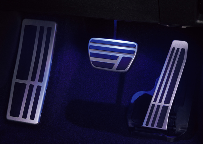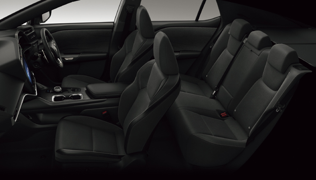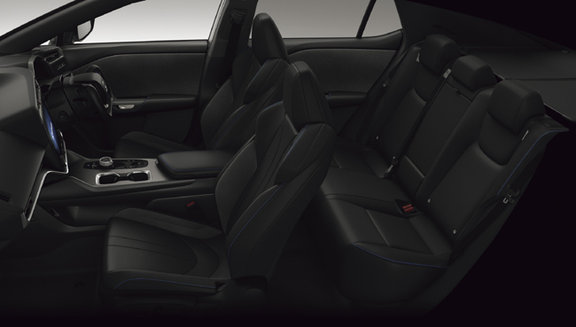 インテリアは専用の内装色としてブラック&ダークグレーを設定。BEVならではの内なる力強さとスポーティな走りをイメージし、ブラックとダークグレーの色と素材にブルーステッチのアクセントを組み合わせる。また、センターコンソールオーナメントパネルにはマイクロジオメトリックパターンフィルムを張り、ドライバーの足もとにはアルミ製スポーツペダル&フットレストを配備した。シートについては、表皮一体発泡工法を用いたL tex表皮のフロントスポーツシートを装着している。