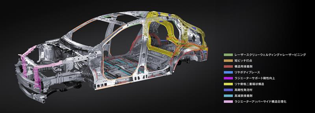 ボディ構造の改良も敢行。走りの味に統一感を持たせるためにレクサスがモデル横断で取り組む走りの“味磨き”の知見を取り入れながら、フロントエンド、フロア、リアエンドの剛性を強化する。具体的には、ラジエータサポートまわりとリアのボディ後端の剛性を向上。フロントのラジエータサポートまわりには板厚、接合の強化を施し、リアにはブレースを追加することで局所的なねじり変形を抑え、ステアリング操作に対するすっきりとリニアな反応を実現した。