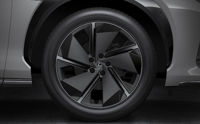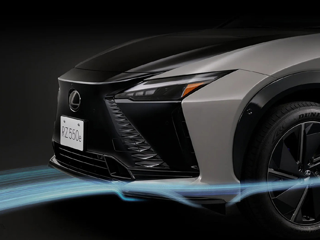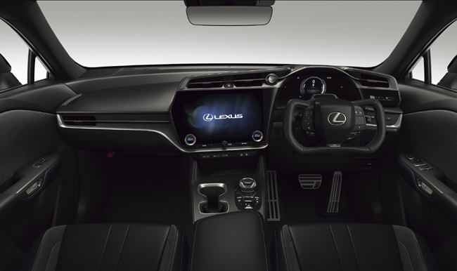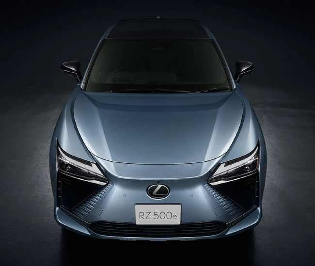 エクステリアについては、機能的本質や動的パフォーマンスに根差し、独自性を追求したデザインを継承。内燃機関のないBEVの機能的な必然性から、フロントマスクは“スピンドルボディ”という塊造形とすることで、レクサスBEVならではのオリジナリティを表現する。また、ヘッドランプおよびバンパーコーナーをブラックアウトし、センターのスピンドルボディを強調することで、一目でレクサスBEVとわかるアイコニックな顔を創出。さらに、バイトーンの外板色ではフロントからルーフまでソリッドブラックを配し、スピンドルボディをより強調するカラーリングとした。足もとにはRZ500eにブラック塗装+切削光輝の20インチアルミホイールを、RZ350eにブラック塗装+ダーククリア切削光輝の18インチアルミホイールを標準で配備している。
