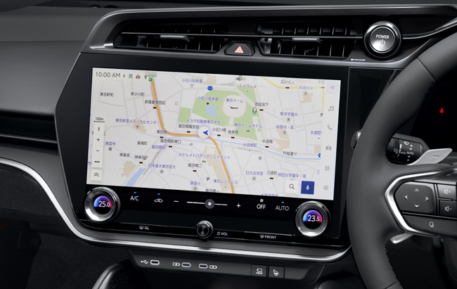 また、進化したステアリング制御とともに「ステアバイワイヤシステム用ステアリングホイール」を採用する。このステアリングホイールでは中立位置から左右約200°の範囲でステアリング操作が可能となり、従来ステアリングホイールのように大きく回転させる必要がないため、より快適な操舵性を提供。また、車速に応じたステアリングギヤ比の制御により、低速運転時の車両の取り回し性の向上や、ワインディングでの軽快な走行を可能にする俊敏性、自動車専用道路などの高速走行時における高い安定性も実現した。上下部分にリングのない形状によってドライバーの視線を自然と前方に誘い、BEVの爽快な走りに集中できるコクピットに仕立てたこともアピールポイントである。