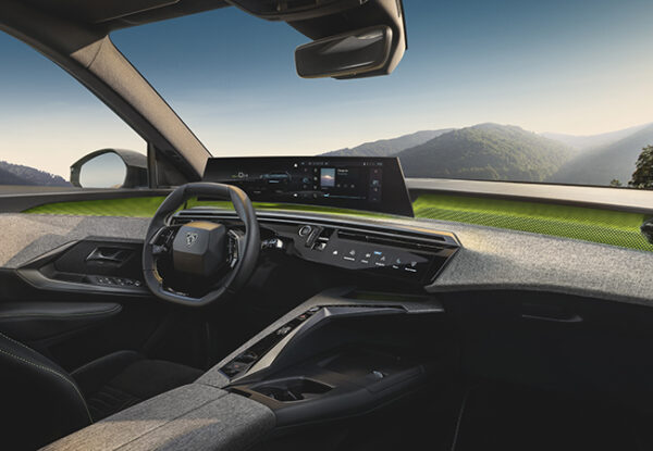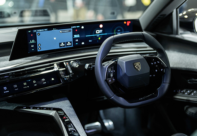 インパネはプジョー最新の「パノラミックi-Cockpit」。大胆で彫刻的な造形とコンパクトなスタイリング、ハイマウントのメーターなどにより直感的なコントロールが可能。ドライバーだけでなくパッセンジャー誰もが新鮮な感動を覚える室内空間になっている。