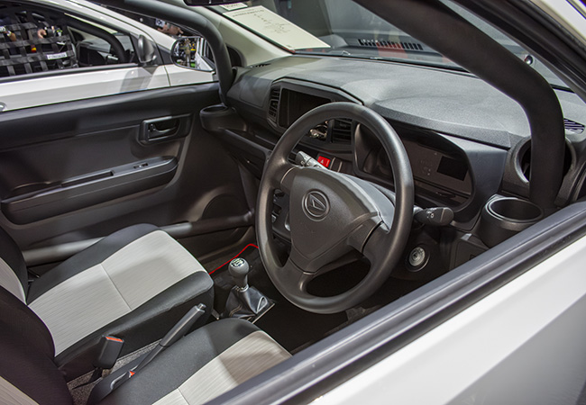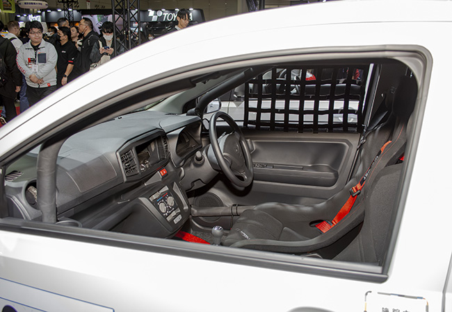 Tuned by D-SPORT Racingの内外装は徹底的にベーシック仕様。これはユーザーが自由に最適なカスタマイズを施しやすくするための配慮。足元はエコタイヤとスチールホイールの組み合わせ。ステアリングやシートも標準ミラ イースそのままの仕様になっている。このクルマ=マシンをサーキット用に仕上げるのか、ラリー用に仕上げるのかに応じて最適なアイテムが異なるので、あえてスペシャル化を図っていないのである。