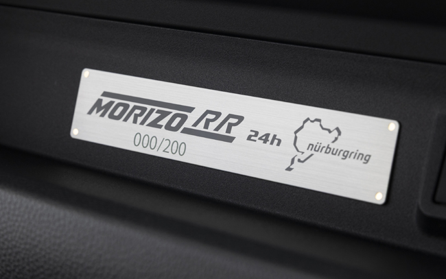 インテリアについても、シグネチャーカラーであるイエローのステッチを随所に採用する。また、スエード表皮を巻いたステアリングホイールはモータースポーツにおける操作性を追求し、外径をひとまわり小径化するとともに、パドルシフトやステアリングスイッチの形状を変更。ステアリングスイッチはGRヤリスRally2からの学びを得て、各種スイッチが独立した形状とする。また、シフトノブ&ブーツやパーキングブレーキレバー&カバーなどにもスエードを使用して、コクピットのスポーティ感を強調。シートにはヘッドレスト刺繍デザインやパーフォレーション色を変更するとともにイエローステッチを入れた専用タイプを配備した。さらに、メーターディスプレイには前述のMORIZOモードの選択が確認できる専用GR Full TFTメーター表示を導入。そして、ダッシュボードにはMORIZO RRロゴやニュルブルクリンク24時間耐久レースのロゴ、そしてシリアルナンバーを刻印した専用プレートを貼付している。
