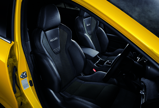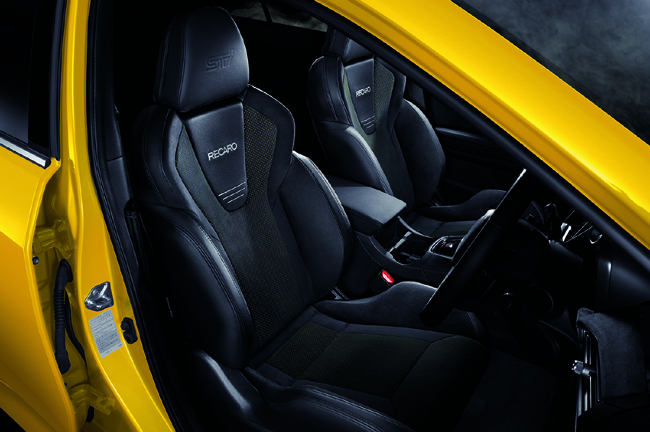 インテリアについては、ブラックステッチを入れた本革巻ステアリングホイール(高触感革)やシフトブーツ、スエード調のインパネミッドトリムおよびドアトリム、ブラック表皮巻のセンタートレイ加飾/フロアコンソールリッド/ドアアームレストなどを特別装備。シートにはブラックステッチとイエローパーフォレーションを配したウルトラスエード表皮のRECARO製フロントシート(STIロゴ入り)および運転席8ウェイパワーシートを装着した。