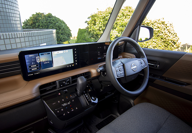 印象的なのはワイドな視界。2台とも実に運転しやすく気持ちがいい。シートポジションがライバルのスーパーハイトワゴンよりやや高めに設定されているからだ。しかもフロントウィンドウ角度を従来型よりも立てるとともに、ピラー形状の工夫により見晴らし性の向上を図っている。ワイドな視界は、車内をより広々と感じさせる要因にもなっている。Kカーで最大サイズを誇るという大画面ディスプレイは見やすくて使いやすかった。