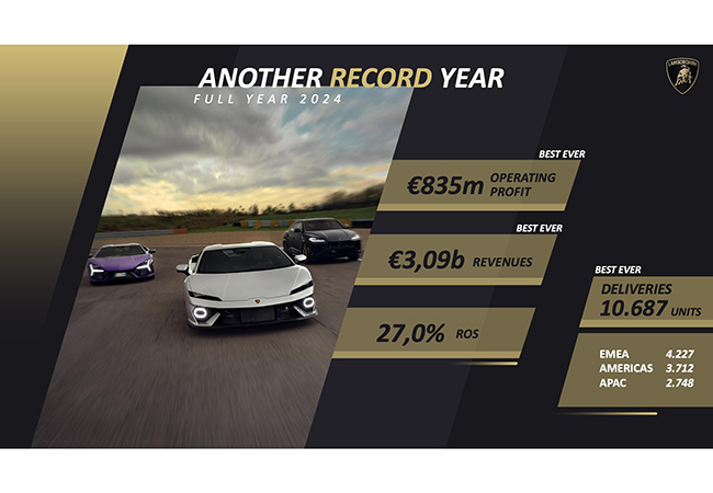 ランボルギーニは、すでに全車の電動化を完了。販売も絶好調。2024年のランボルギーニの世界販売は1万687台。2017年比で約2.8倍に急伸し、利益は8億3500万ユーロ(約1376億円)に増大。いまや利益率は27%と驚異的なレベルに達している