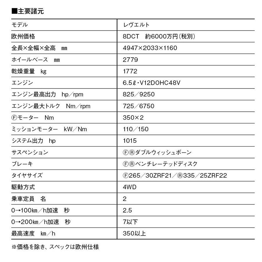 レヴエルトはミウラ/カウンタック/ディアブロ/アヴェンタドールの系譜に連なるV12スーパーモデル。新開発6.5リッター・V12自然吸気ユニットと計3基のモーターを組み合わせた先進のPHEV。システム出力は1015cvと超弩級