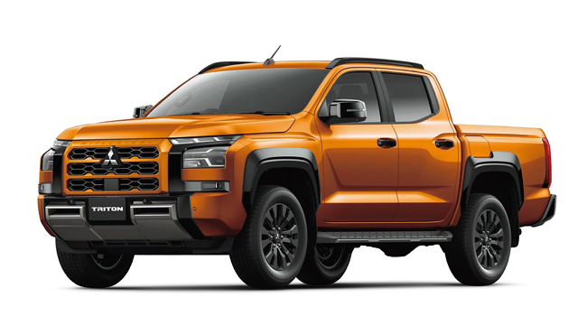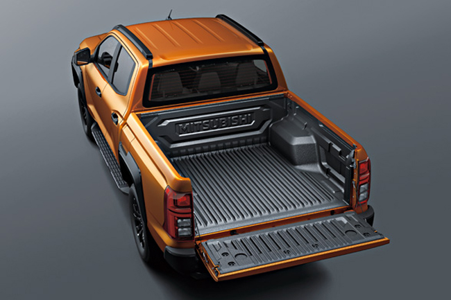 ▲三菱トライトンGSR 価格:551万8700円 全長5360×全幅1930×全高1815mm ホイールベース3130mm 車重2120kg 乗車定員5名 WLTCモード燃費11.3km/リットル 車種展開はGSRグレードに1本化。写真のボディカラーはヤマブキオレンジメタリック