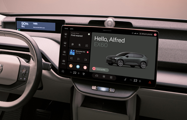 内包するインテリアは、インパネ上部を水平基調にアレンジして前方視界を高めたうえで、高品質グラフィックスのドライバーディスプレイおよびヘッドアップディスプレイ、大型のセンタースクリーンディスプレイを採用するとともに、独自開発技術とGoogle、NVIDIA、Qualcomm Technologies などのテクノロジーリーダーの優れたサービスや技術を融合した、最先端のハードウェア・ソフトウェア基盤である「HuginCore」の最新バージョンを搭載。自然でパーソナライズされた会話が可能なGoogleの新AIアシスタント「Gemini」をボルボ車として初めて導入したこともアピールポイントである。また、ボルボ車として初めて前後4席すべてのヘッドレストにスピーカーを内蔵したプレミアムなBowers&Wilkins製28スピーカーオーディオシステムを設定。さらに、ボルボ車として初めてDolby Atmosに対応したApple Musicをプリインストールし、没入感あふれるオーディオ体験を提供する。