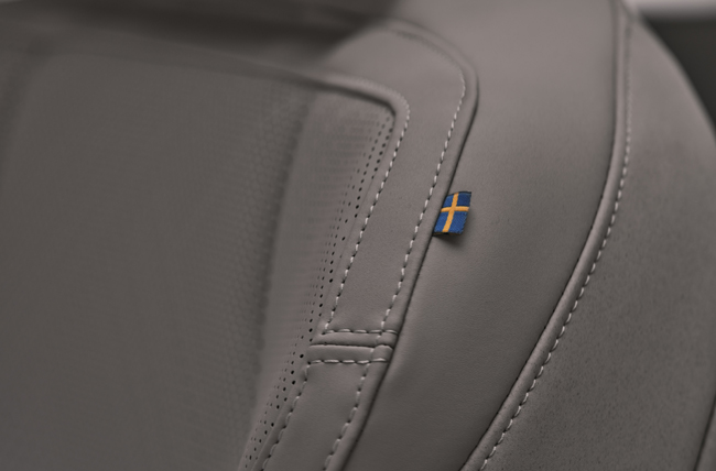 ▲2970mmというロングホイールベースやフラットなフロアを活かして、広々とした後席足もと空間を確保。シート仕様にはリサイクル素材を使用したテキスタイルなど多彩な表皮を用意する。前席にはスウェーデン国旗のタグを付ける
