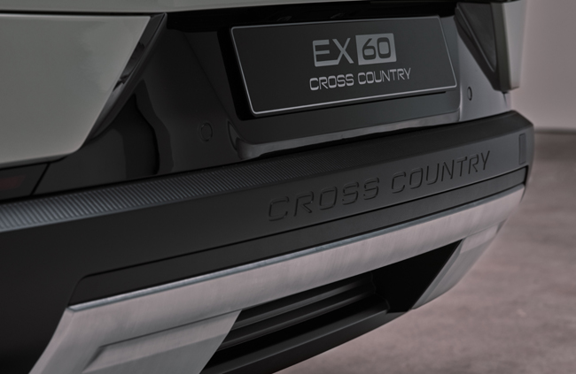 エクステリアについては既存のEX60のクロスオーバーSUVスタイルを基調に、車高を約20mm高めたうえで、フロントとリアのブラッシュド仕上げステンレス製スキッドプレートやマットブラックのボディ下回りパーツおよびホイールアーチエクステンションなどを装備して、よりアグレッシブなルックスと悪路の走破性を強化。また、前後バンパーやDピラーには“CROSS COUNTRY”ロゴを入れ、足もとには専用デザインの21インチアルミホイールと255/45R21タイヤを装着する。さらに、専用ボディカラーとしてアウトドア志向のキャラクターを強調する新色のフロストグリーンを設定した。