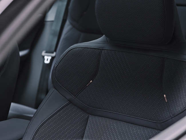 インテリアの造形に関しては既存のEX60を踏襲し、インパネ上部を水平基調にアレンジして前方視界を高めたうえで、高品質グラフィックスのドライバーディスプレイおよびヘッドアップディスプレイ、大型のセンタースクリーンディスプレイを採用するとともに、独自開発技術とGoogle、NVIDIA、Qualcomm Technologies などのテクノロジーリーダーの優れたサービスや技術を融合した、最先端のハードウェア・ソフトウェア基盤である「HuginCore」の最新バージョンを搭載。自然でパーソナライズされた会話が可能なGoogleの新AIアシスタント「Gemini」も組み込む。一方、専用のアレンジとしてウェザードグレイのアッシュや、北極の風景にインスパイアされたエンボス加工模様のトポグラフィーの装飾、チャコールテキスタイルのマットなどを装備して、クロスカントリーならではの深くダイナミックな雰囲気を創出。シートには通気性のあるミッドナイトブルーのテーラーニットを配した。