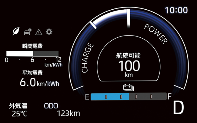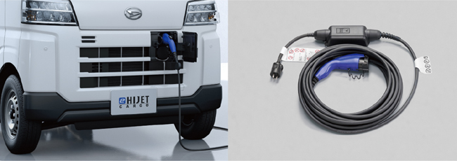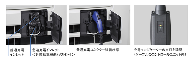 充電については、最大6kWのAC普通充電とCHAdeMO方式のDC急速充電に対応。7mの普通充電用ケーブル(AC200V)を標準装備するとともに、外出先で急速充電器が使用可能な急速充電インレットを全車に標準で組み込み、約50分の急速充電で電欠ランプ点灯から充電率80%を実現する。また、急速充電インレットの採用によってクルマから建物への給電ができるV2Hの利用を可能とした。さらに、走行時でも使えるAC100V・1500Wアクセサリーコンセント(非常時給電システム付)を装備。フロントドアとドアガラスを閉めた状態でも車外に電源コードを引き出して給電できる外部給電アタッチメントも設定している。