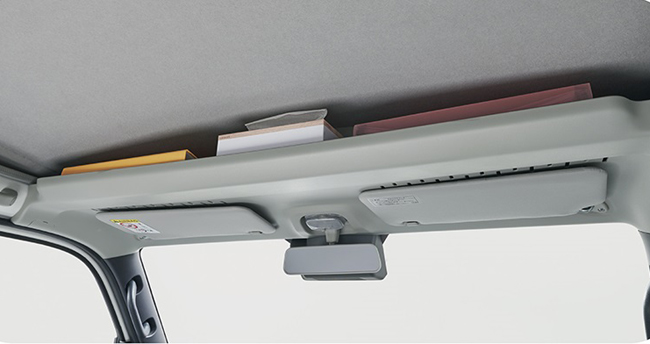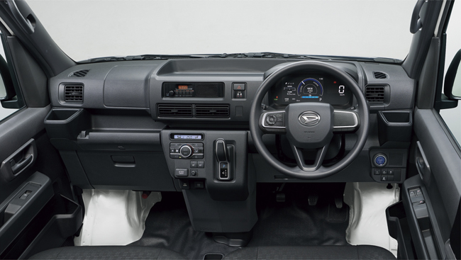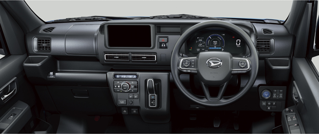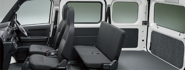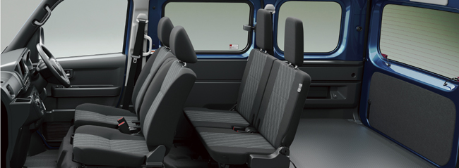 インテリアはブラックの内装色を基調に、フロントセンターアームレストやニードルパンチのフロアマット、成形天井、スライドドアトリム、デッキサイドトリム(スリット付)、乗降グリップ(後席左右)&アシストグリップ(後席)、大型LED荷室灯、ボトルホルダー(後席)、運転席左側ポケット、シートバックポケット(助手席)、デッキサイドポケット(左右)、メッキインナードアハンドル(フロント)、センターエアコンレジスター(シルバー加飾)、メッキエアコンレジスターノブ(センター)などを標準で採用。フルファブリック表皮のシートには専用意匠を施し、合わせて分離式ヘッドレスト(フロント/リア)やセパレートタイプの水平格納式リアシートを配備した。