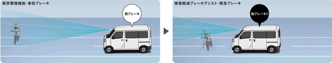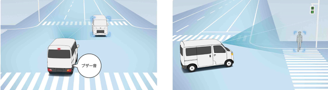 ▲最新の予防安全機能「スマートアシスト」を採用。ステレオカメラの性能を向上させ、横断中の自転車(写真・上)や、交差点での右折時に対向方向から直進してくる車両および右左折時に対向方向から横断してくる歩行者(同・下)を認識可能とする