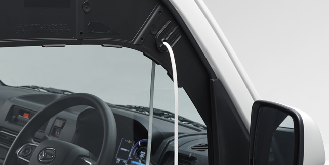 e-ハイゼット カーゴのエクステリアに関しては、充電口をフロント部に配したことからフロントマスクの一部をガソリン車から変更したり、“e-HIJET CARGO”および“e-SMART ELECTRIC”の専用エンブレムを貼付したりした以外は、既存のガソリン車のイメージを踏襲。ボディ同色フロントバンパーや材着のフロントロアバンパー/リアバンパー/ドアハンドル/バックドアハンドル、LEDヘッドランプ(ロー&ハイビーム・オートレベリング機能・LEDクリアランスランプ/オートライト機能付)、LEDリアコンビネーションランプなどを標準で装備する。ボディカラーはホワイトとブライトシルバーメタリックのほか、選べるカラーパックとしてアイスグリーンをオプションで設定した。