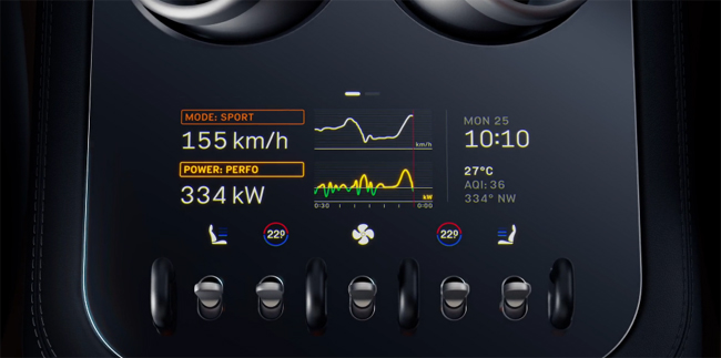 一方でセンター部には、特注形状で高解像度の有機ELスクリーンとカバーガラス、機械加工のアルミニウム製フレーム、背面から伸びるアノダイズ処理したアルミニウム製ブラケット、トグルスイッチなどで構成したコントロールパネルを配備。ドライビングエクスペリエンスを強化する自己完結型の情報表示パネルとして設定し、3個の物理的ボタンで空調、車両セッティング、メディアの操作ができる。また、右上部には時計/コンパス/60秒ストップウォッチを表示するマルチグラフを組み込んだ。さらに、頭上にも専用のコントロールパネルを設置。ローンチモードを起動する物理的レバーのほか、エクステリアライトやデフロスター、緊急SOSシステムのスイッチを配している。