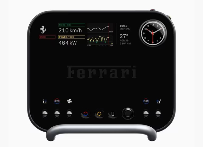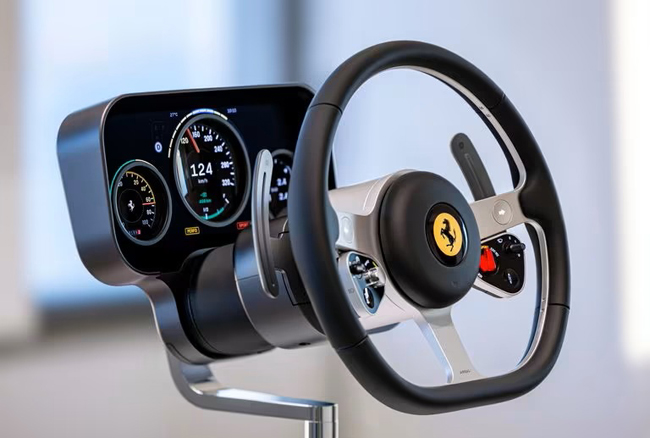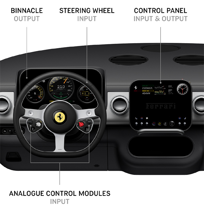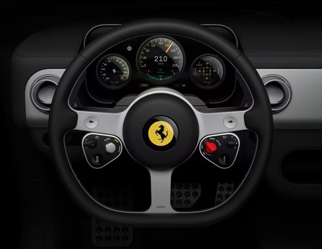 フェラーリの新世代のデザイン哲学と、協業するLoveFromの先進機能を高度に融合させたコクピットは、すべてのソリューションがフェラーリの機能目標、パッケージ制約、市販ロードスポーツカーのホモロゲーション要件を満たすように設計される。インターフェースは明確な構成理念に従ってデザインし、スイッチ類やディスプレイは機能的にまとめられ、最も重要なコマンドおよびフィードバック機能はドライバーの真正面に設置。精密に設計した機械式のボタンやメーター、トグルおよびスイッチ類が、多機能デジタルディスプレイと組み合わせて配される。フラットボトムの3本スポーツのステアリングは単体のアルミニウムから削り出し、左右スポーク下部にはアナログのコントロールモジュールをレイアウト。コントロールモジュールは左側にシステムへの電力供給を最適化して電力と航続距離を管理するe-MANETTINOやクルーズコントロール、ADASのスイッチを、右側に走りの特性を変化させる複数のダイナミクスコントロールが設定できるMANETTINOやサスペンション、ワイパーのスイッチを配備した。また、ステアリング基部にはパドル操作によってトルクを手動で制御し、滑らかに加減速できるパドル式マニュアルトルクコントロールをセットしている。