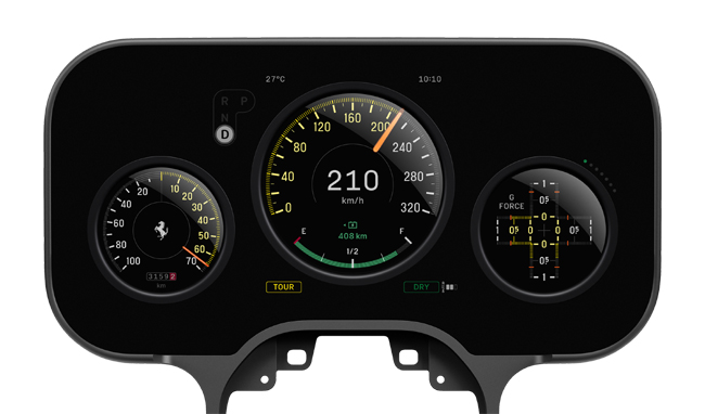 計器類やスイッチ類を収めるビクナルについては、デジタル式と機械式の計器が巧みに組み合わされた重層的な3連ディスプレイを配備。各メーターはアルミニウム製ベゼルと精密機械加工のガラスレンズを備え、アノダイズ処理したアルミニウム製ハウジングに収める。機械式の針とデジタルの文字盤を組み合わせたセンターメーターは、速度とバッテリー残量を表示。また、左側のパワーメーターはe-MANETTINOのモードと連携し、利用可能な出力と回生ブレーキを表示する。そして右側のドライバーメーターは、Gメーター/車両ステータス/バッテリー/走行距離/ダイナミクス/タイヤという7種類の機能データを表示し、調節は右側のアナログコントロールモジュールの機械式トグルスイッチで行う仕組みとした。