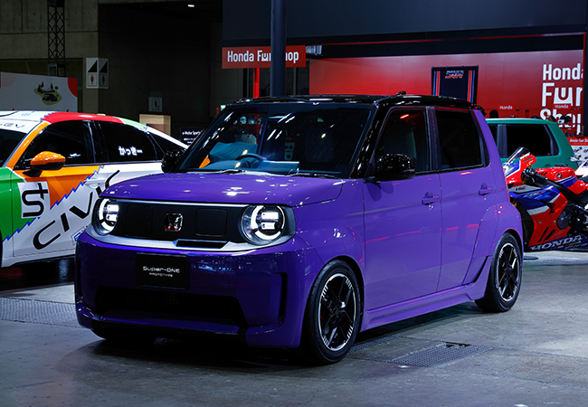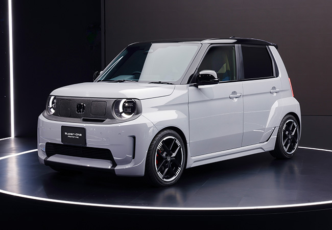 スーパーONEは「意のままに操る喜び」を追求したBEV。仮想有段シフト制御とアクティブサウンドコントロールの協調により、ワクワクする走りを演出。KカーのN-ONE e:ベースながら性能はフルスペック。モーター出力は70kWを誇る。グッと張り出したブリスターフェンダーが印象的。市販車はBOSEシステムなど装備も充実。