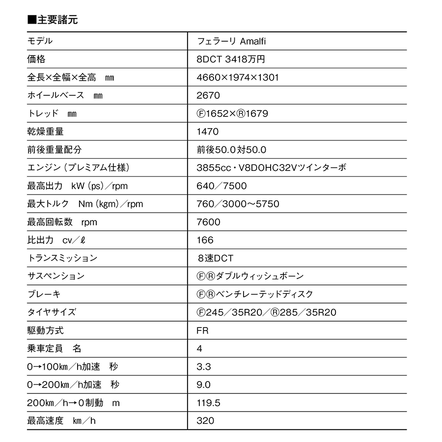 なんて話をするとアマルフィにレーシーさがないように思われるかもしれないがそうではない。アマルフィは3.9ℓのV8ツインターボ(640cv)を搭載。ローマ+20cvのパワーソースは「コルサ」モードで豹変する。V8サウンドと共にドライバーをゾクゾクさせる領域に突入するのは明白だ。