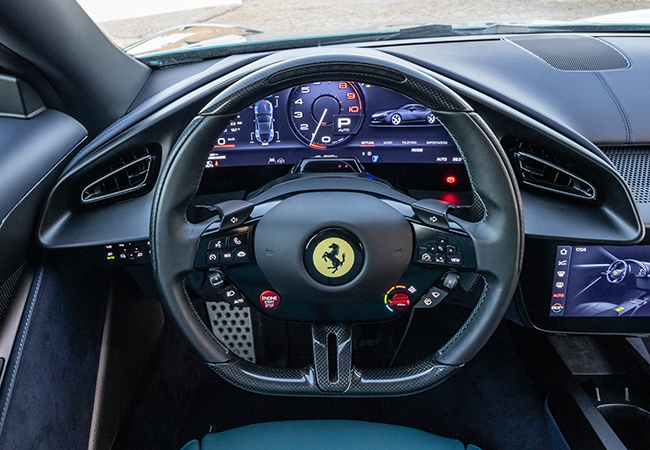 このあたりは日常使いを前提にしたサスペンションのセッティングとEPS(電動パワーステアリング)を基にしたグリップ推定システムが関与していると思われる。後者は296GTBで導入されたシステムで、それを今回バージョンアップした。全領域で路面のグリップレベルを見極める制御システムが効率的にトラクションを管理してくれる。よってキャビンはフラットにキープされ、高級感が得られるのだ。