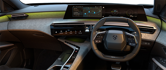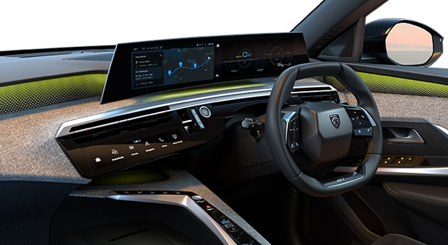 ▲ドライビングエルゴノミクスを最適化する最新世代のプジョーi-Cockpitとなる「プジョー パノラミックi-Cockpit」を採用。ダッシュボードには優れた視認性を持つワイドな21インチのパノラミックカーブドディスプレイをビルトインする。日本導入モデルのハンドル位置は右