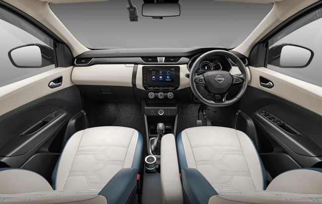 エクステリアについては、日産のグローバルデザインランゲージと調和した、力強く自信に満ちた独自のアイデンティティを確立したことがトピック。伸びやかなプロポーション、力強いボディライン、張り出したホイールアーチ、そして182mmという十分な最低地上高により、さまざまな走行環境に対応する堂々とした佇まいを実現する。また、フロントおよびリアに配したシグネチャーのCシェイプがグラバイトのビジュアルアイデンティティの中核を成し、プレミアムかつ現代的な印象とともに、高いブランド認知性を創出。さらに、フード部の専用ブランディングやリアドアのバッジが、力強く自信に満ちたデザインをいっそう際立たせている。各部のデザインにもこだわり、シグネチャーLEDヘッドランプ(デイタイムランニングライト内蔵)やLEDフォグランプ、クリスタルのような透明感と立体感を備えたLEDリアコンビネーションランプ、専用のピアノブラック2Dグリル、ボールドデュアルトーンの15インチフレックスアロイホイール(TEKNAグレード)などを配備。実用性を高めるルーフレールや、乗降性と使い勝手を考慮した大開口ドアも採用した。ボディサイズは全長3987×全幅1734×全高1644mm、ホイールベース2636mmに設定している。