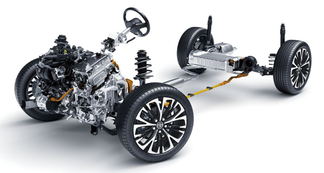 ▲ハイブリッド車の2WDはM15A-FXE型1490cc直列3気筒DOHC12V“ダイナミックフォース”ガソリンエンジン(91ps/12.2kg・m)+1NM型フロントモーター(59kW/141Nm)+リチウムイオン電池(容量4.3Ah)+電気式無段変速機で構成するリダクション機構付THSⅡを搭載