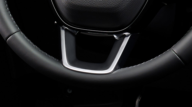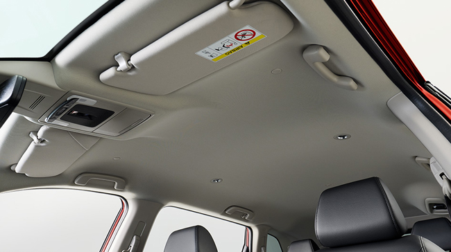 ▲RS BLACK EDITIONは写真上よりピアノブラックのステアリングロアーガーニッシュ、へアラインダークシルバー仕上げのインパネ&ドアライニングガーニッシュ、ブラックのルーフ&ピラーライニングを採用