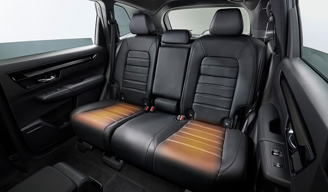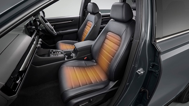 まずパッケージングの面では、街中でも山道でも安心して運転できる、CR-VのDNAともいえる価値を継承したうえで、アイポイントやドライビングポジション、乗り降りしやすいヒップポイントの高さなどのパッケージングを磨き上げる。ドライビングポジションではステアリング角度を従来モデルの28度から25度へと変更し、ステアリングを立てることで安心して運転を楽しむことができ、体格にかかわらずステアリング操作がしやすい運転姿勢を実現。また、後席空間は足もとのスペースを従来モデルから前後長で16mm拡大し、クラストップレベルの広さを確保することで、ゆとりある空間を達成する。8段階の調節機能をもつ後席リクライニングを配して、長距離の移動でも疲れにくい着座姿勢を提供したことも訴求点だ。さらに、4WDモデルには前席/後席シートヒーターを標準装備。RS BLACK EDITIONには前席ベンチレーションも採用して、季節を問わず快適な室内環境を創出した。