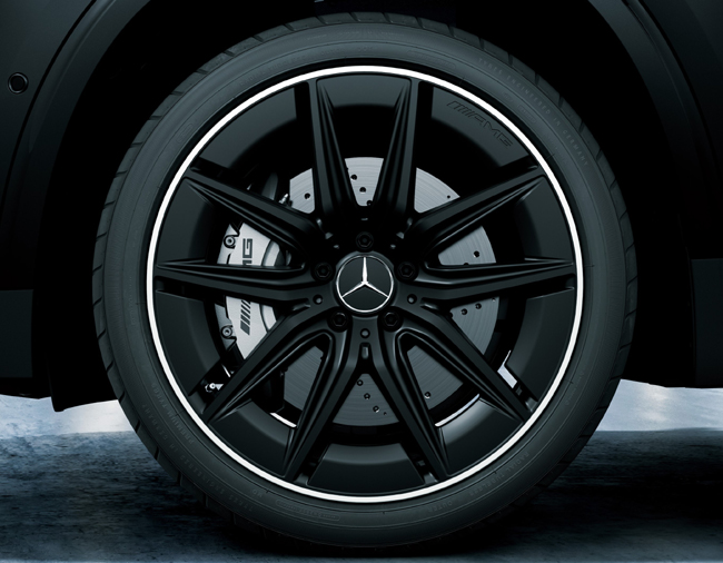 今回の特別仕様車は、内外装をブラックでトータルコーディネートして、よりシックで精悍なハイパフォーマンスSUVに仕立てたことが特徴である。まずエクステリアでは、ボディカラーにコスモスブラック(メタリック)を纏ったうえで、通常モデルでは未設定の「AMGナイトパッケージ」および「AMGエクステリアナイトパッケージⅡ」を採用し、フロントグリル、サイド/リアバッジ、フロントスプリッター、エグゾースト テールパイプトリムなど細部までハイグロスブラックまたはブラッククロームのアクセントを施す。また、ルーフレールもブラックで仕上げ、さらに足もとにはブラック塗装の20インチAMGアルミホイール(RTW)を装着。乗員の開放感を高めるパノラミックスライディングルーフも標準で組み込んだ。