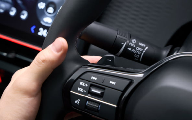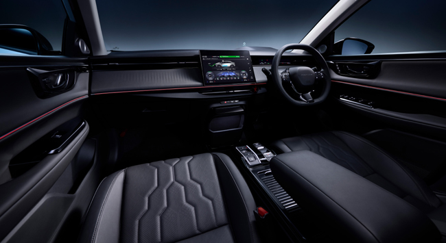 内包するインテリアは、ブラックの内装色を基調に、包み込むような造形と空間全体のつながりを意識したラウンドデザインを導入したことがトピック。上質なソフトパッド素材を採用するとともに、収納やワイヤレス充電器などの装備で使い勝手を高めることで、室内全体が一体となって心地よく過ごせる室内スペースを実現する。装備面では、視界を遮らず膝もとも拡げるために楕円形としたシンセティックレザーステアリングホイールや、多様な情報を見やすく表示する9.4インチデジタルグラフィックメーター、12.8インチのディスプレイオーディオ、室内を囲むライン状のLEDアンビエントランプ、広大で臨場感豊かなサラウンド体験を生むBOSEプレミアムサウンドシステム、運転中の視線の線上に様々な情報を表示する大型ヘッドアップディスプレイ、車両後方の映像をルームミラー内に表示するとともに車両前後方を録画できるドライブレコーダーも内蔵したセンターカメラミラーシステムなどを採用。6種類用意しているアロマカートリッジのうち3種類まで装着でき、ディスプレイで香りを選択できるアロマディフューザーも設定した。