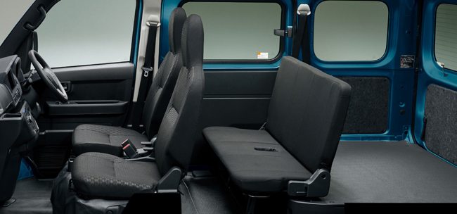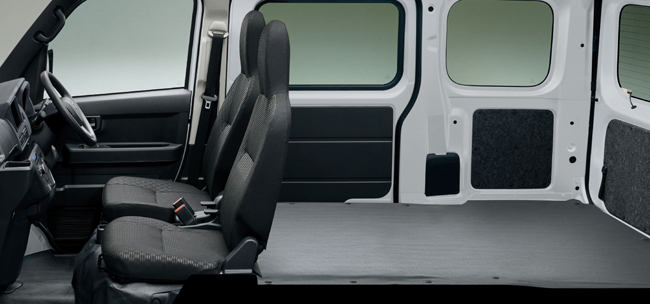 既存のガソリン車と同等の高い積載性と使い勝手の良さを実現した点もトピックだ。大容量バッテリーやe Axleを床下に最適配置することで、既存のガソリン車と同等となる軽キャブオーバーバン最大級の積載スペース(4シーターで荷室長2名乗車時1920/4名乗車時1005mm、荷室幅2名乗車時1270/4名乗車時1410mm、荷室高1250mm)と最大積載量350kgを確保し、積載性と使い勝手の良さを継承。バックドア開口部は開口高1165mm、開口幅1345mmを実現し、荷室地上フロア高はガソリン車と同等の630mmに抑える。水平格納式リアシートと助手席前倒し機構を活用すれば、2650mmの長尺物の積載も可能だ。また、室内ユースフルナットを30個(4シーター。2シーターは47個)配して利便性を高め、かつ荷室床面の凹凸を無くして荷物が傷つきにくく出し入れのしやすいフラットな空間を創出。さらに、キャビン空間にはアッパートレイや室内の頭上スペースを活用したオーバーヘッドシェルフなどを装備し、運転席から手が届く範囲を中心に豊富な収納スペースを設けた。