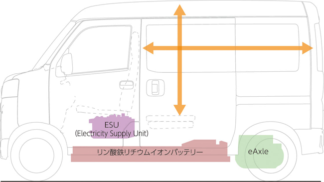 注目のパワートレインは、スズキとダイハツが培った小さなクルマづくりのノウハウと、トヨタの持つ電動化技術を組み合わせ、3社共同で新開発したBEVシステムを採用する。システム構成は最高出力47kW(64ps)/3562~4500rpm、最大トルク126Nm(12.9kg・m)/0~3562rpmを発生するモーターとインバーター、トランスアクスルを一体型とした「e Axle(イーアクスル)」を後輪駆動軸上に、電力供給ユニットのESU(Electricity Supply Unit)を前席下に配置するとともに、総電力量36.6kWhの薄型リン酸鉄リチウムイオン(LFP)電池を床下に搭載した。走行面では、軽ターボ以上のトルクを発揮して力強い走りを実現し、また適度な回生ブレーキによって電費の向上と運転のしやすさを両立。さらに、後輪駆動軸上に配置したe Axleと床下に配置して低重心を果たした駆動用バッテリーにより、多積載時や登坂時でも後輪駆動の高いグリップ力を確保して、力強い発進とスムーズな加速を成し遂げた。停車時と加速時ともに高い静粛性を実現したことも訴求点だ。性能としては、一充電走行距離がWLTCモードで257km、交流電力量消費率が同モードで161Wh/kmを達成している。