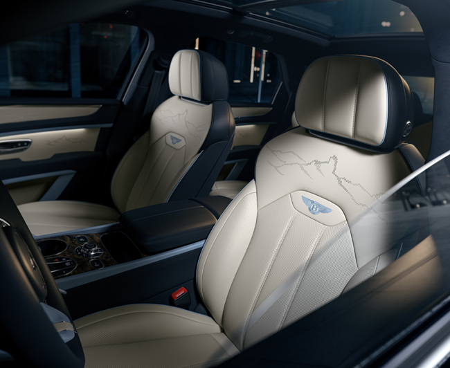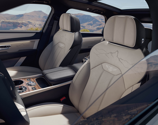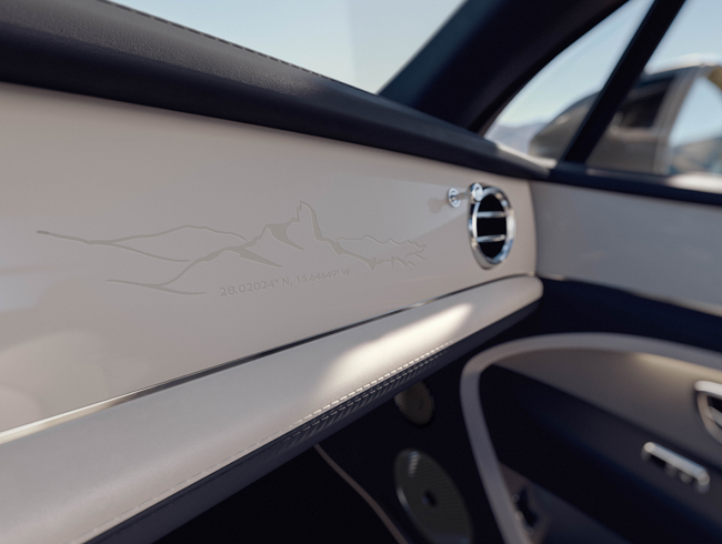 内装については、前述のロケ・ベンテイガの山をレーザー加工でエッチングしたインパネフェイシアや、同山をレーザー加工によるパーフォレーションパターンとして刻印したシートおよびドアトリムを専用装備したことがトピック。シートにはエアポケットを使用して体にかかる圧力を少しずつ分散させ、血流の滞りや疲労の蓄積を防ぐポスチュラルアジャストや、シート表面の温度と湿度を検知し、検知結果に基づいてシートヒーターやベンチレーターを作動させるシートオートクライメートも内蔵する。また、ドアシルには“Artenara Edition”ロゴ入りトレッドプレートを配備した。内装の仕様としては、ボディカラーにマッチしたトライカラーのインテリアスキームを採用。プライマリーハイドカラーのレザーインサートも設定し、コントラストパイピングのアクセントも選択可能としている。