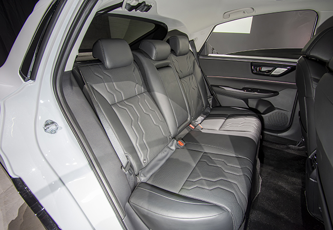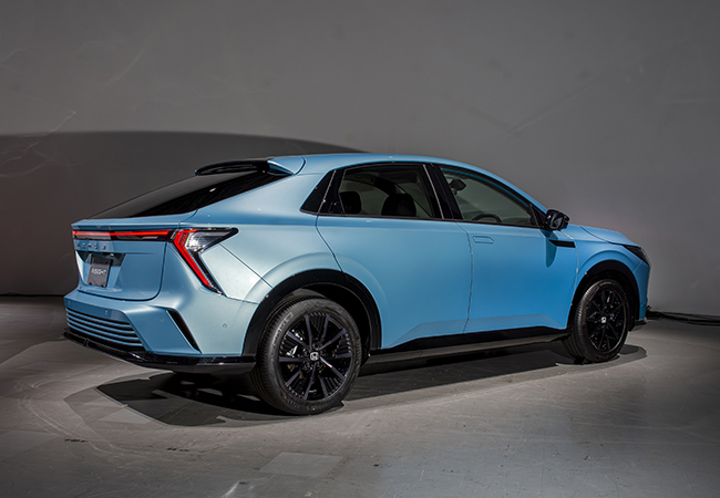 グランドコンセプトは“存在感際立つ、個性派BEV”。止まっていても前進感を感じさせる未来的な造形でまとめている。ファルムは伸びやかでスポーティ。サイドまで回り込んだ特徴的なポジション灯を配した薄型LEDライト、一文字デザインのリアコンビライトが印象的だ。フロントグリル中央の“Hマーク“が光るのも新鮮である。