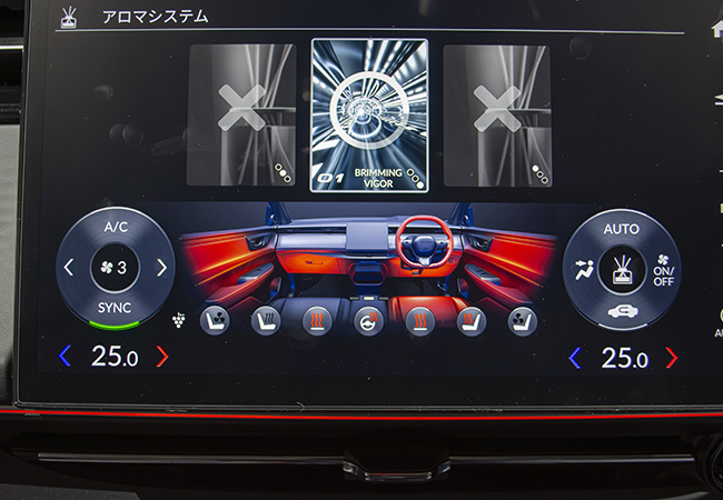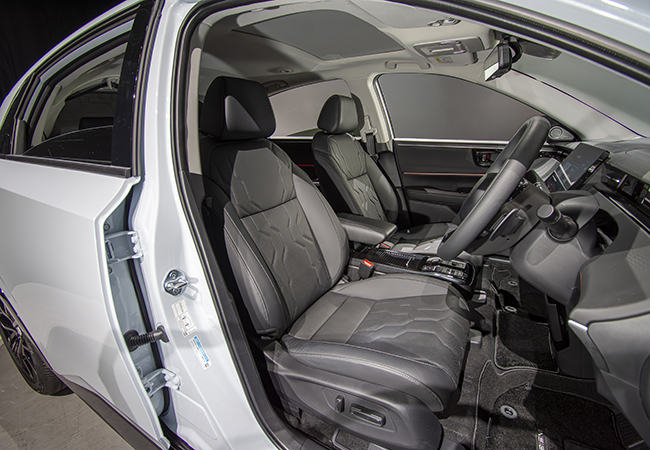 インパネはスッキリとした水平基調。ステアリングは前方視界と膝回りのスペースに配慮した楕円形状。各種情報を最適表示するヘッドアップディスプレイが標準だ。アピールポイントは香りを楽しめるアロマディフューザー、高音質BOSEプレミアムサウンド、多彩なLEDアンビエントランプ。斬新な気配りで“新感覚の快適”を実現した。足元だけでなく輻射熱を利用して室内全体を効率よく温めるインテリアヒーターとシート&ステアリングヒーターを協調制御するインテリジェントヒーティングシステムも新しい。新型インサイトは、従来のホンダ車とはひと味違う提案性を秘めたBEVである。