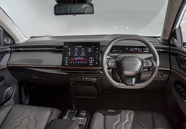 パフォーマンスは、心昂る軽快感と操縦フィールを追求。高トルクモーターと軽量化でドライバーを魅了する圧倒的な加速と、意のままのハンドリングを実現した。モーター最大トルクは310Nm。足回りには先進の周波数感応型ダンパーを組み込んでいる。走行モードはスポーツ/ノーマル/ECON/スノーの4種。スポーツでは、加減速のダイレクト感が増し、アクティブサウンドコントロールの演出が入る。またブレーキの減速度は、パドル操作で3段階に調節可能だ。航続距離はホンダBEV初の500kmオーバー。ライバルとなる日産リーフB5(521km)とほぼ同等。軒並み航続距離を伸ばしている最新BEVのなかでは、とくに目立つ数値ではないものの、日常ユースから長距離ドライブまでカバーすると判断できる。