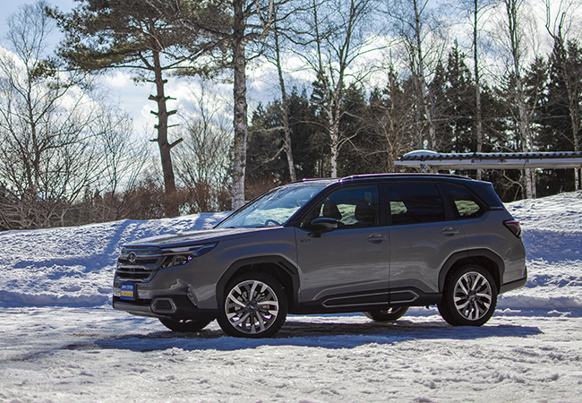 SUBARUフォレスター・リミテッドS:HEV EX/価格:CVT 459万8000円。SUBARU独自のシンメトリーAWDを熟成したフォレスターの雪上性能は信頼感たっぷり。開発陣は「車体剛性の向上が足回りの接地性向上をもたらした」と説明。なかでもS:HEVのリニアなトルク特性が光る