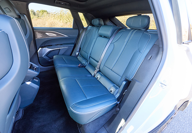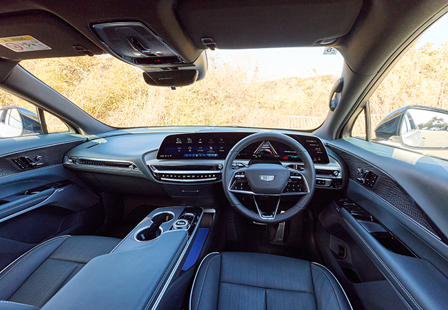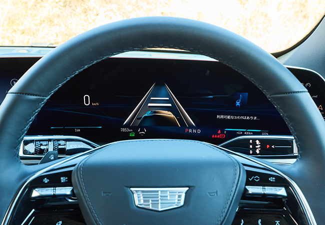 室内は先進イメージ。前後席とも広々としており、作りも入念。キャデラックならではのクラフトマンシップが息づいている。湾曲した33インチの大型モニターは、日本語表記とされているのが特徴。ガラス製大型パノラマルーフが装備され、開放感を満喫することもできる。
