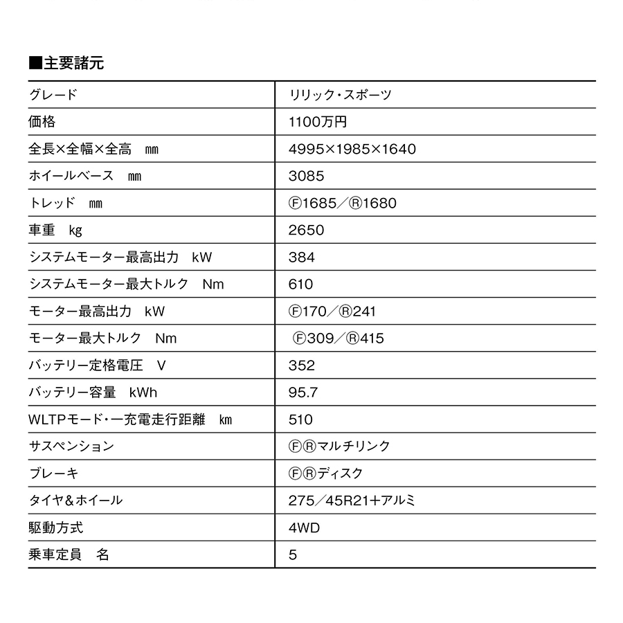 パフォーマンスは俊敏で力強い。最高出力522ps(384kW)、最大トルク610Nmを発生し、0→100km/h加速を5.5秒でクリアするというだけのことはある。バッテリーは95.7kWの容量、一充電で510kmの走行を可能としている。