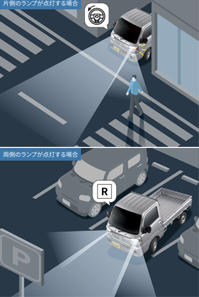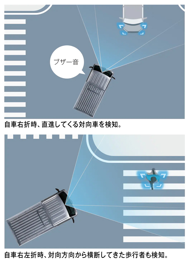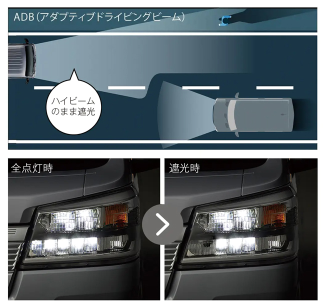 まず、予防安全システム「スマートアシスト」の機能を拡充。対横断自転車の検知機能や「交差点右折時の対向車線の車両」および「右左折時の対向方向から来る横断歩行者」検知機能を追加して、より安全かつ安心なドライブを実現する。さらに、エクストラグレードにはLEDヘッドランプ(ロー/ハイビーム・オートレベリング機能・LEDクリアランスランプ・オートライト付)や、ハイビームで走行中に先行車や対向車を検知した際に部分的に遮光して先行車や対向車に配慮しながら高い視認性を確保するアダプティブドライビングビーム(ADB)、ハンドルを切った方向やターンランプを出した方向を明るく照らし、またシフトをRレンジに入れると左右のランプが点灯するサイドビューランプを標準装備して、夜間走行時の安全性を高めた。