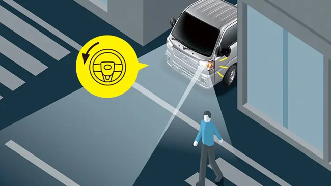 まず、予防安全システム「スマートアシスト」の機能を拡充。対横断自転車の検知機能や「交差点右折時の対向車線の車両」および「右左折時の対向方向から来る横断歩行者」検知機能を追加して、より安全かつ安心なドライブを実現する。また、TCおよびグランドキャブにはLEDヘッドランプ(ロー/ハイビーム・オートレベリング機能・LEDクリアランスランプ・オートライト付)や、ハイビームで走行中に先行車や対向車を検知した際に部分的に遮光して先行車や対向車に配慮しながら高い視認性を確保するアダプティブドライビングビーム(ADB)、ハンドルを切った方向やターンランプを出した方向を明るく照らし、またシフトをRレンジに入れると左右のランプが点灯するサイドビューランプを標準装備して、夜間走行時の安全性を高めた。さらに、TCおよびグランドキャブにはメーカー装着オプションとしてスマートフォン連携9インチディスプレイオーディオを設定している。