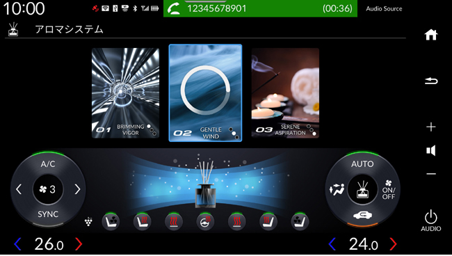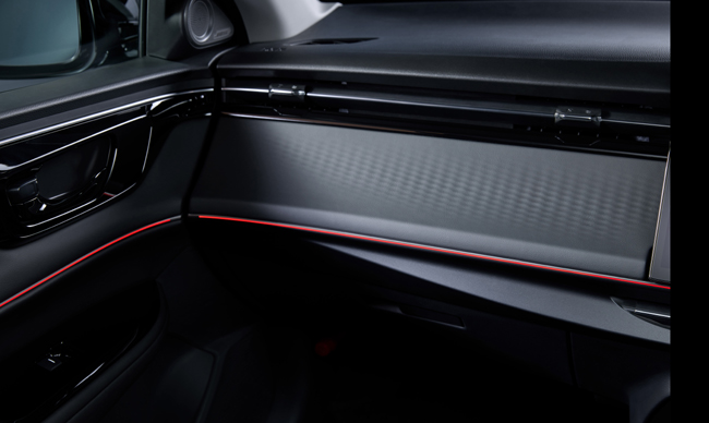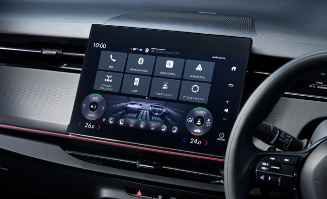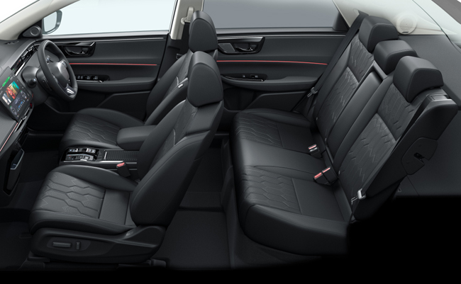 内包するインテリアは、ブラックの内装色を基調に、包み込むような造形と空間全体のつながりを意識したラウンドデザインを導入したことがトピック。上質なソフトパッド素材を採用するとともに、収納やワイヤレス充電器などの装備で使い勝手を高めることで、室内全体が一体となって心地よく過ごせるキャビン空間を実現する。装備面では、視界を遮らず膝もとも拡げるために楕円形としたシンセティックレザーステアリングホイールや、多様な情報を見やすく表示する9.4インチデジタルグラフィックメーター、12.8インチのディスプレイオーディオ、室内を囲むライン状のLEDアンビエントランプ、広大で臨場感豊かなサラウンド体験を生むBOSEプレミアムサウンドシステム、運転中の視線の線上に様々な情報を表示する11.5インチ相当のヘッドアップディスプレイ、車両後方の映像をルームミラー内に表示するとともに車両前後方を録画できるドライブレコーダーも内蔵したセンターカメラミラーシステムなどを採用。6種類用意しているアロマカートリッジのうち3種類まで装着でき、ディスプレイで香りを選択できるアロマディフューザーも設定した。