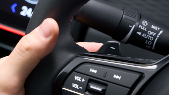 ▲インテリアはブラックの内装色を基調に、包み込むような造形と空間全体のつながりを意識したラウンドデザインを採用。視界を遮らず膝もとも拡げるために楕円形としたシンセティックレザーステアリングホイールを装備