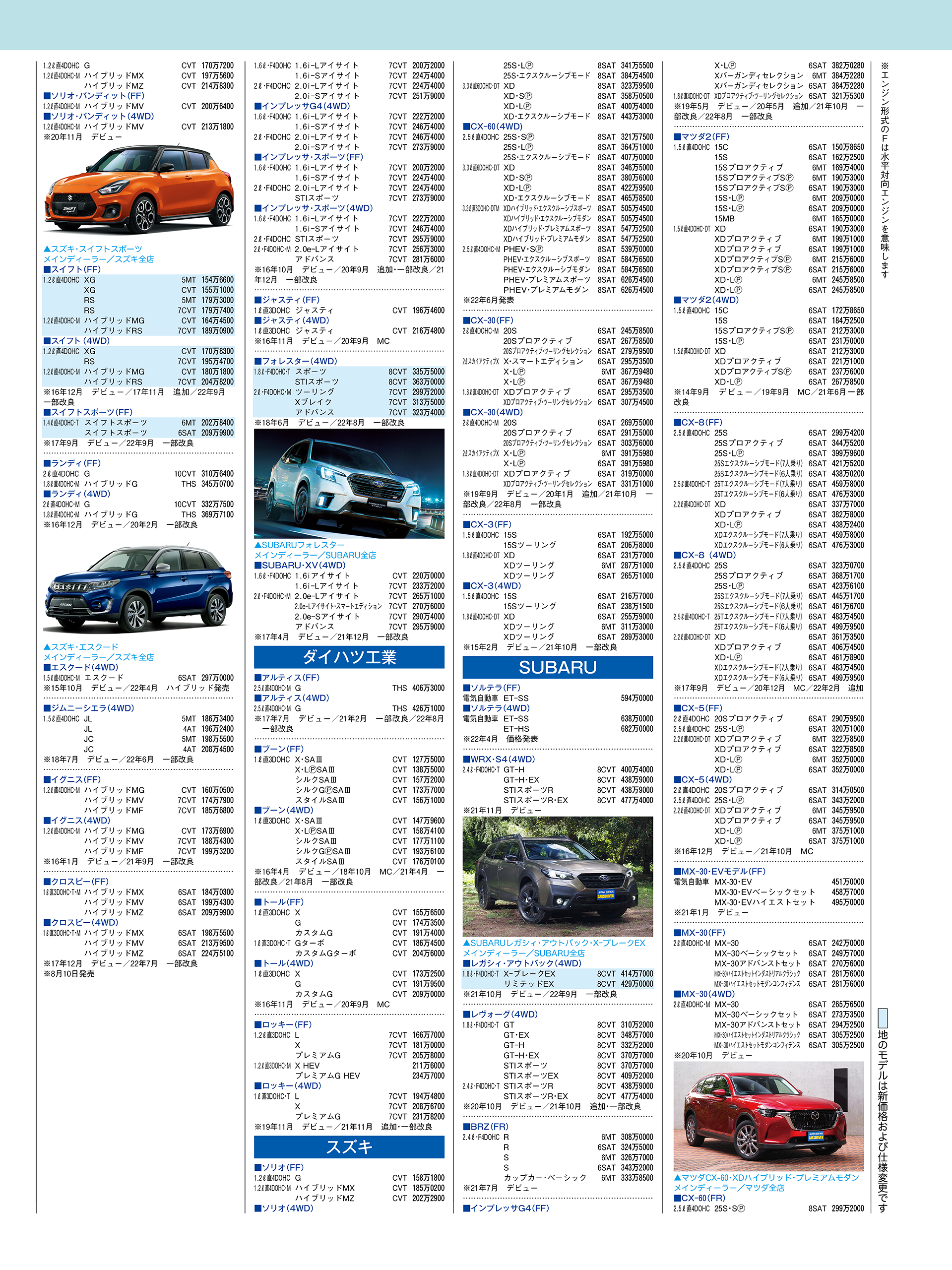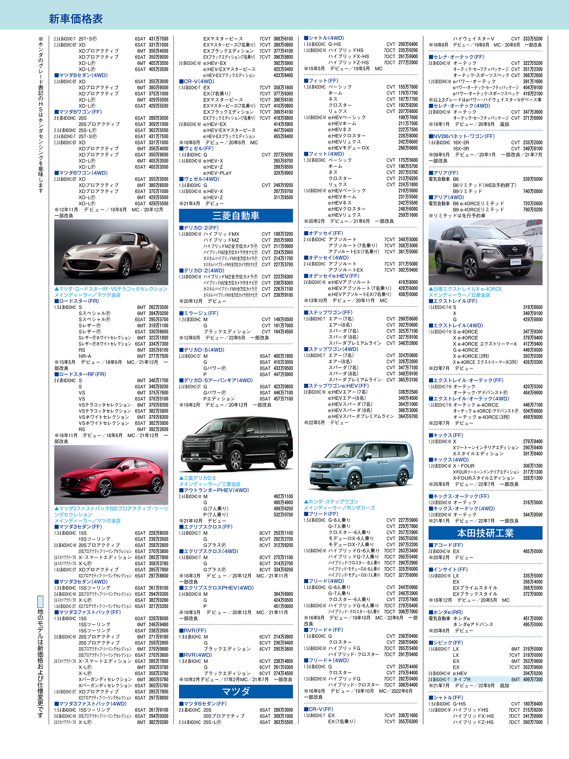 新車価格表(国産車、2022年3月25日現在)